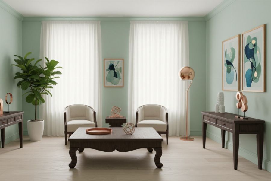 Les neutres sont les partenaires les plus sûrs du vert d'eau. Le blanc pur amplifie sa fraîcheur et crée une ambiance lumineuse, type maison de bord de mer. Le beige et le blanc crème apportent de la chaleur sans concurrencer la teinte pastel. Le gris perle offre un rendu contemporain et élégant, particulièrement adapté aux chambres. Ces associations fonctionnent parce qu'elles créent un contraste doux qui met en valeur le vert d'eau sans le surcharger.